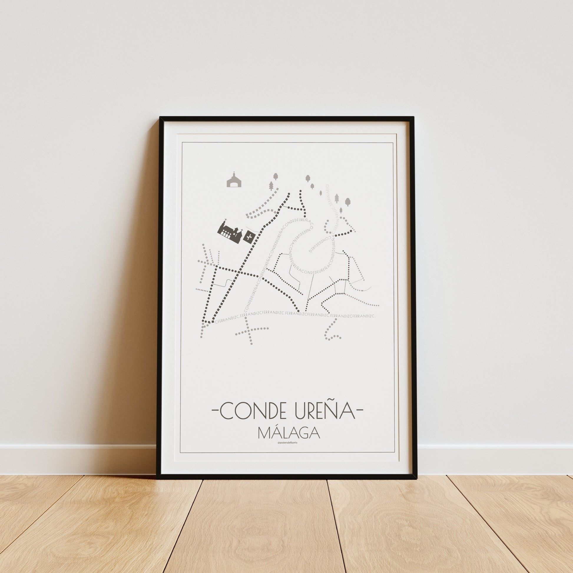 Sube la cuesta hasta Monte Victoria y llévate este diseño gráfico "hecho a mano" del barrio Conde Ureña en Málaga, dibujado con amor para que lo exhibas en tu lugar favorito: simplemente elige tamaño, color y orientación, y recuerda que el marco no está incluido.